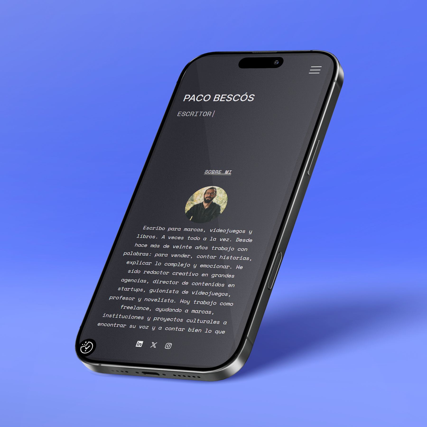Desarrollo de la web personal de Francisco Bescós, escritor, redactor creativo, guionista y creador de contenidos con una trayectoria que abarca la publicidad, la narrativa, el branded content y la ficción. Concebimos un sitio que ordena y da sentido a sus distintas facetas profesionales, reflejando su experiencia en agencias, startups y proyectos culturales.