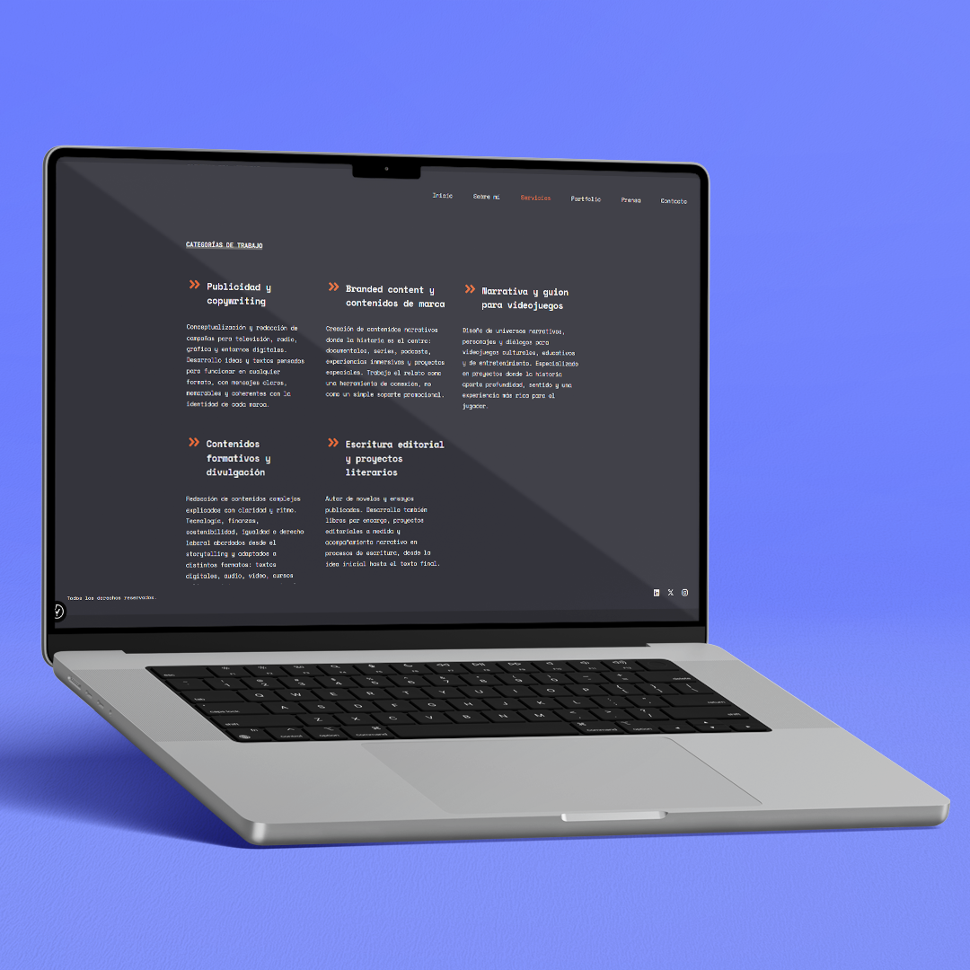 La web pone el foco en la palabra como eje central, con una estructura clara y una navegación directa que facilita la lectura y el acceso a sus trabajos. El resultado es un espacio digital sobrio y coherente, alineado con su manera de entender el storytelling: claridad, precisión y capacidad de permanecer.